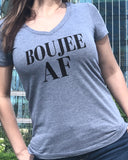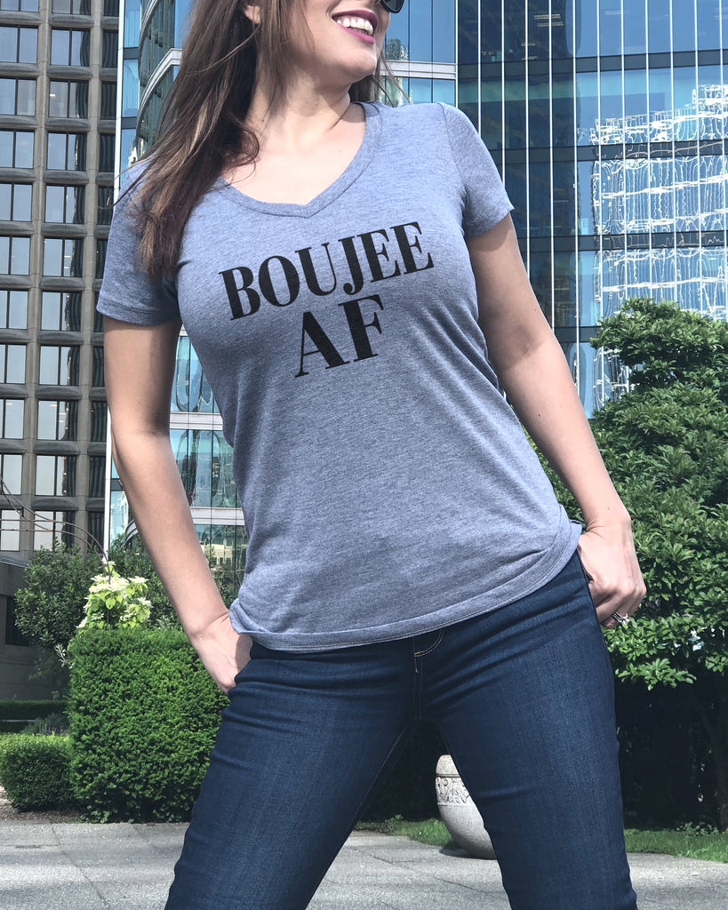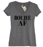 Love your rose', weekend brunch, and your Louie? Let everyone know with this heather gray women's very soft and comfortable fitted v-neck tee with "Boujee AF" print in black.