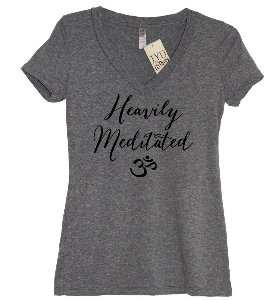 Have you had your daily dose of om? A heather gray women's very soft and comfortable fitted v-neck tee with "Heavily Meditated" and om symbol print in black.