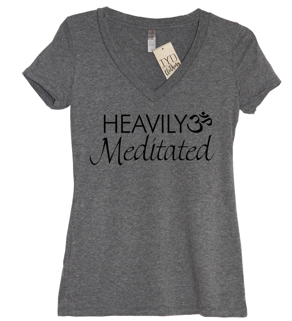 Have you had your daily dose of om? A heather gray women's very soft and comfortable fitted v-neck tee with "Heavily Meditated" and om symbol print in black.