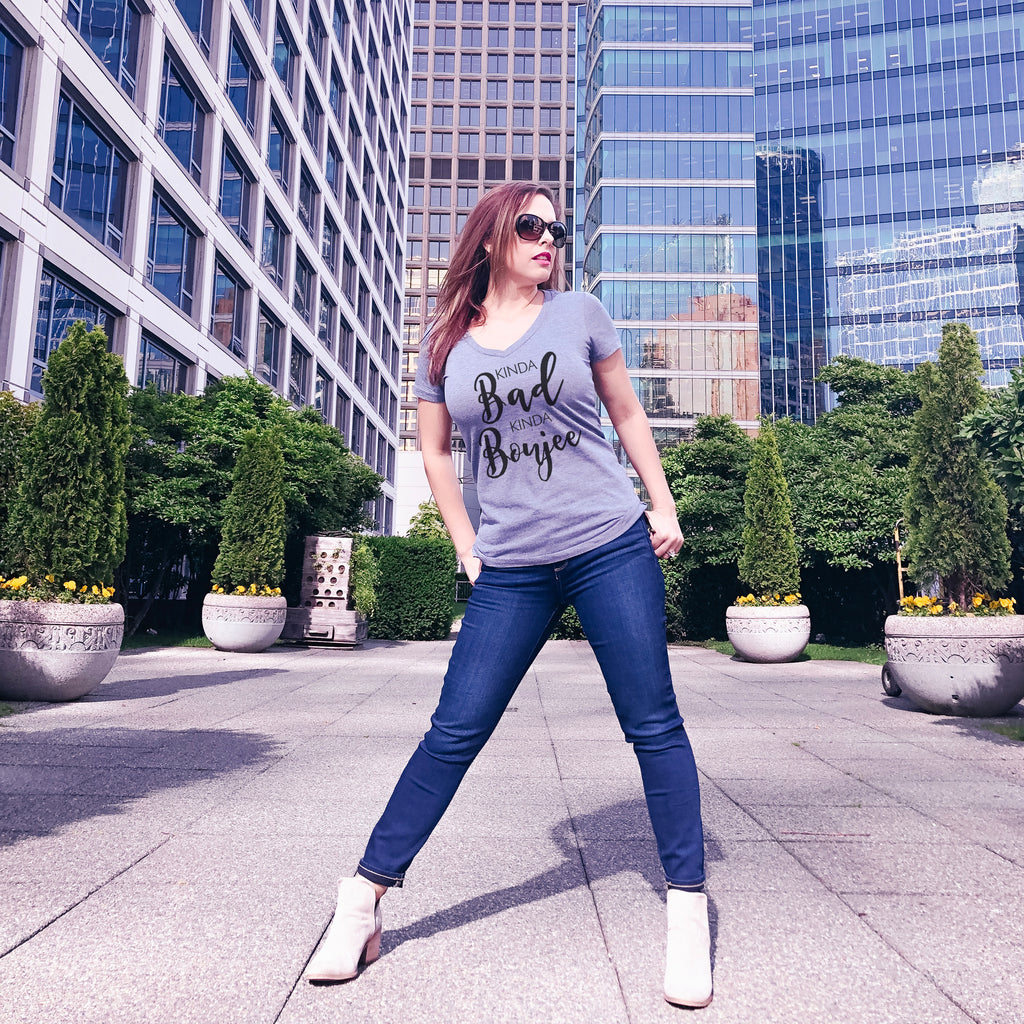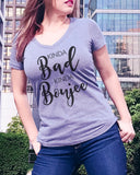 Can you go from lady to ghetto in 10 seconds? Listen to Tupac on your way home from spin? Let everyone know with this heather gray women's very soft and comfortable fitted v-neck tee with "Kinda Bad Kinda Boujee" print in black.