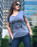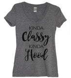 Can you go from lady to ghetto in 10 seconds? Listen to Tupac on your way home from spin? Let everyone know with this heather gray women's very soft and comfortable fitted v-neck tee with "Kinda Classy Kinda Hood" print in black.
