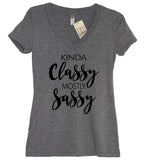 For all you classy and sassy ladies! A heather gray women's very soft and comfortable fitted v-neck tee with "Kinda Classy Mostly Sassy" print in black.