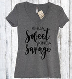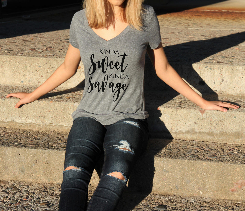 Are you sweet with a savage side? Let everyone know with this heather gray women's very soft and comfortable fitted v-neck tee with "Kinda Sweet Kinda Savage" print in black.