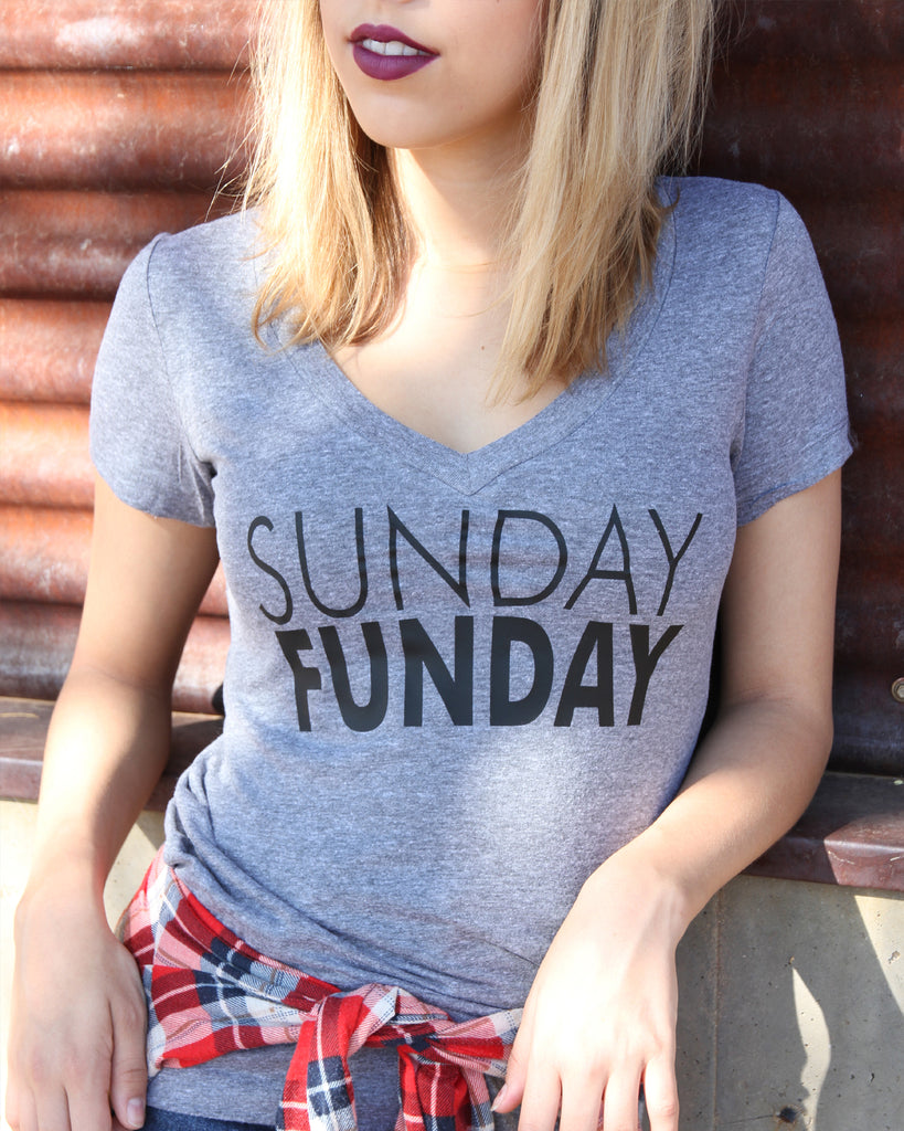 Make Sunday your funday! A heather gray women's very soft and comfortable fitted v-neck with black "Sunday Funday" print.