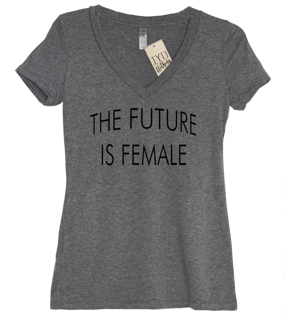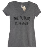 Let the world know what the future will be like with this heather gray women's very soft and comfortable fitted v-neck tee with black "The Future Is Female" print.