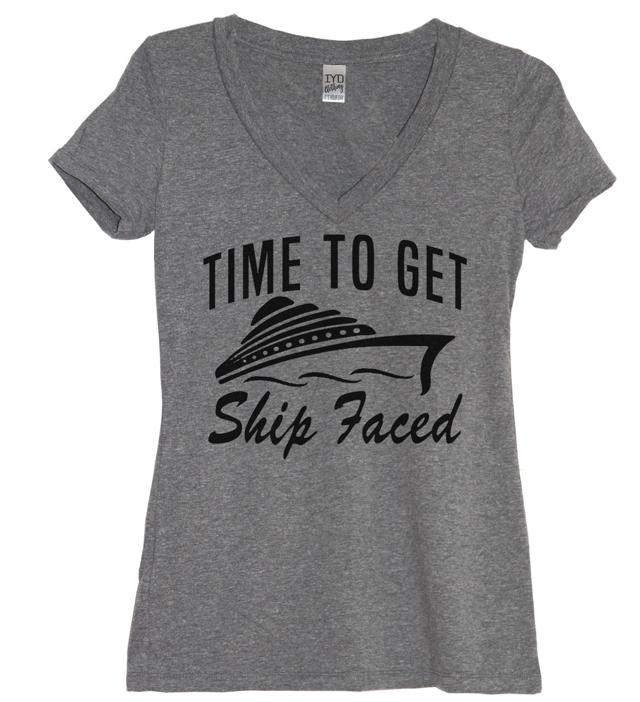 Get your cruise on with this heather gray women's very soft and comfortable fitted v-neck tee with "Time To Get Ship Faced" and ship print in black.